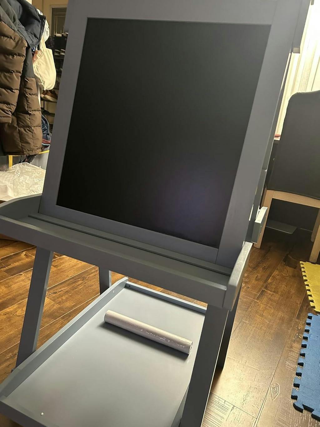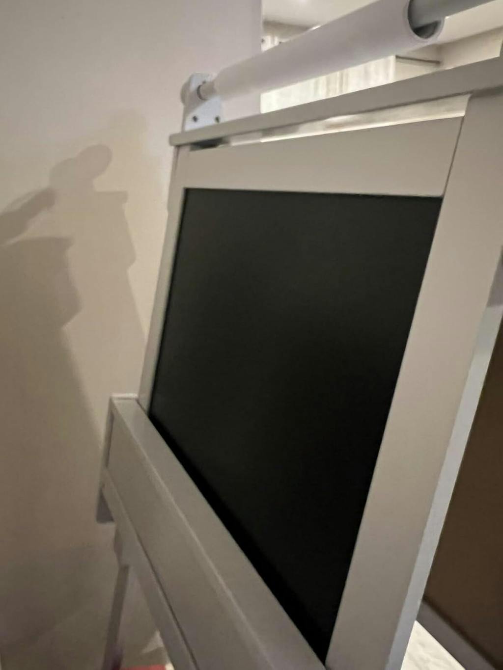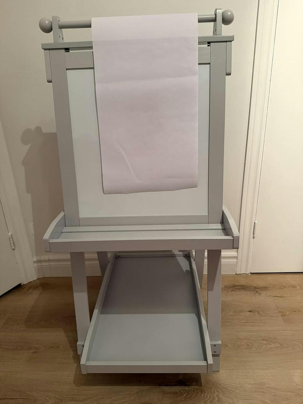 A magnetic whiteboard, a chalkboard and a paper roll included
