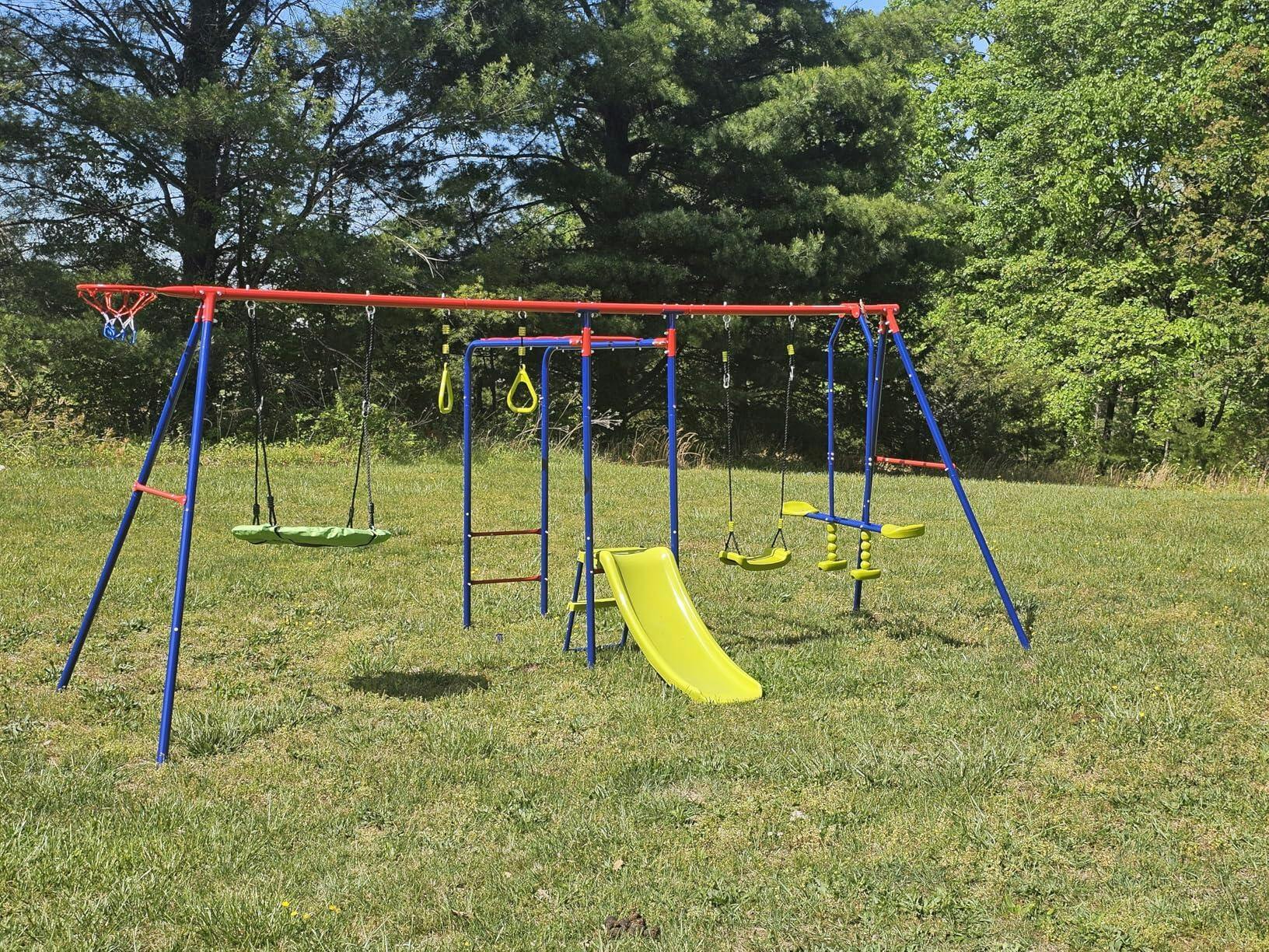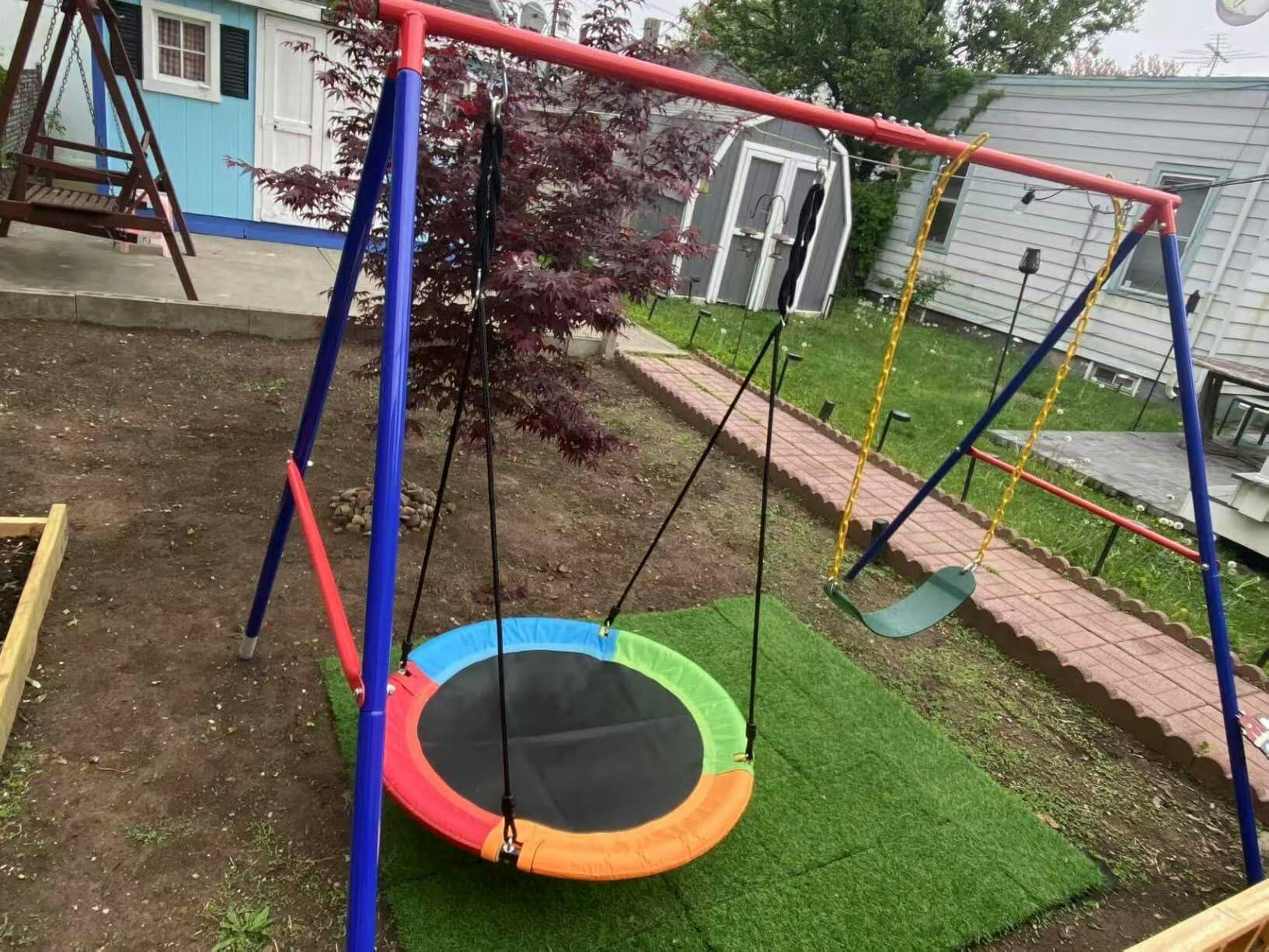 OLAKIDS kids swing sets for backyard is a great outdoor playing choice for both kids and adults. Featuring with a slide, 2 swings, a glider, trapeze rings, monkey bar and a basketball hoop to meet different playing needs. Kids are able to spend hours happily swinging and playing independently outside, which is benefit to their mental and physical health. Recommended for kids 3-10 years old within 660lbs weight together. A-frame and 4 ground stakes ensure the extra stability. Made of metal and powder-coating finish, this giant play swing set is rust-resistant and perfect for setting up outdoor as patio or backyard playground. With a clear instructions manual, this heavy duty swing set can be put together quickly and easily.